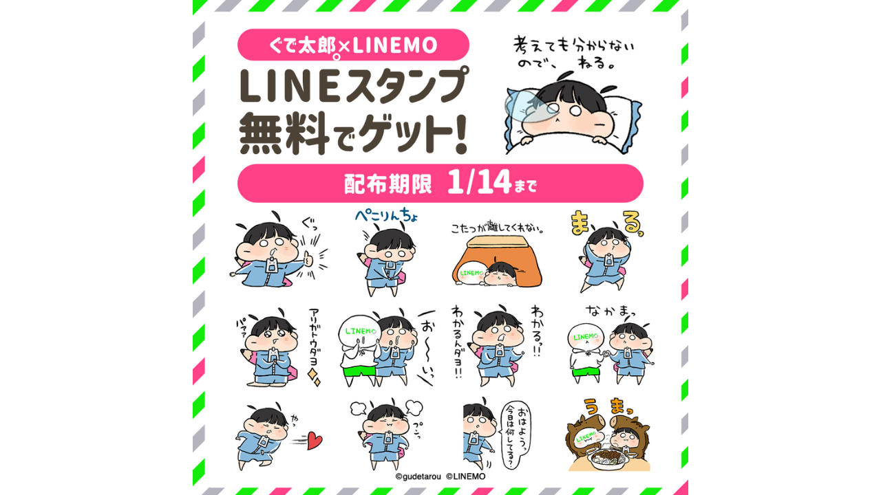 《期間限定》大人気「ぐで太郎。」のコラボスタンプが出たよ!ユーモア溢れる16種類のスタンプで、友だちとのトークを盛り上げよう♪LINEMO|ラインモ公式アカウントと友だちになるともらえるよ!配布期間:2026/01/14まで