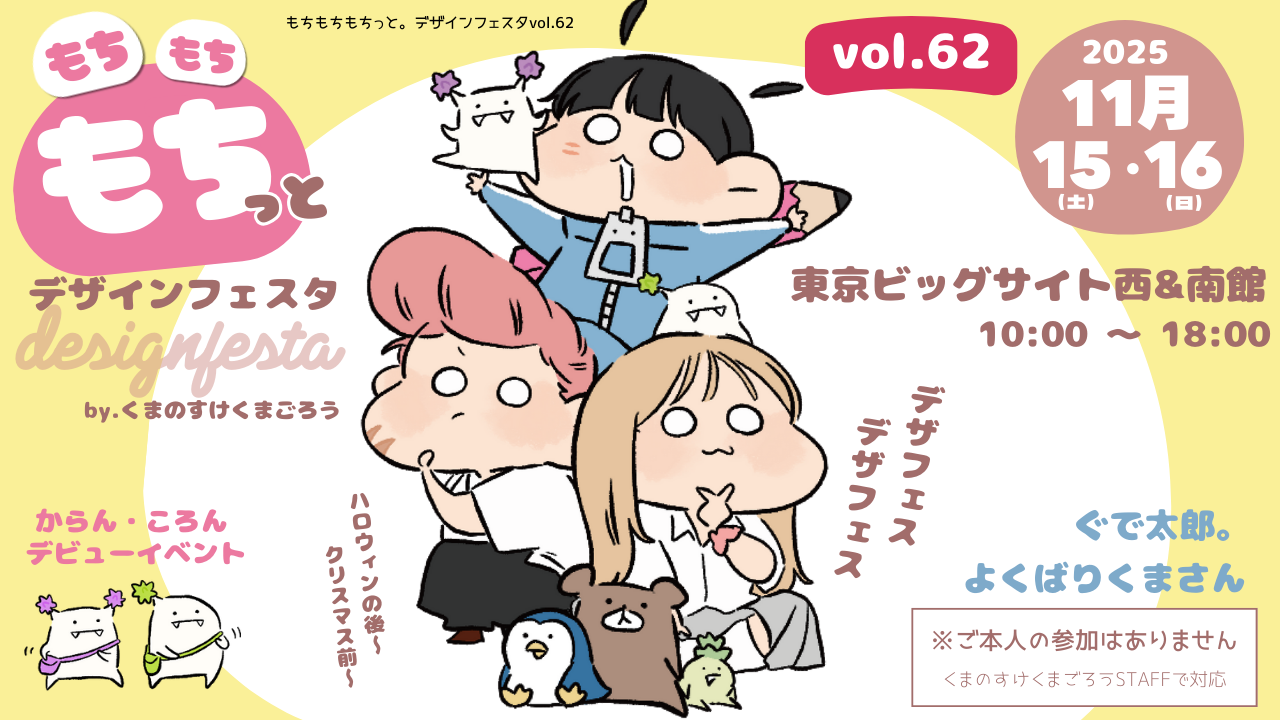 デザインフェスタvol.62 event&shop 2026.04.10 2025年11月15日(土)・16日(日) 10:00 〜 18:00 東京ビッグサイト 西&南館 くまのすけくまごろうさんのブースにて合同出店します